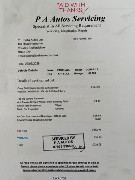 * Fresh Service & Inspection 23/03/2026 @ 66,803 Miles (Long Life Oil, Oil, Air & Cabin Filters)
